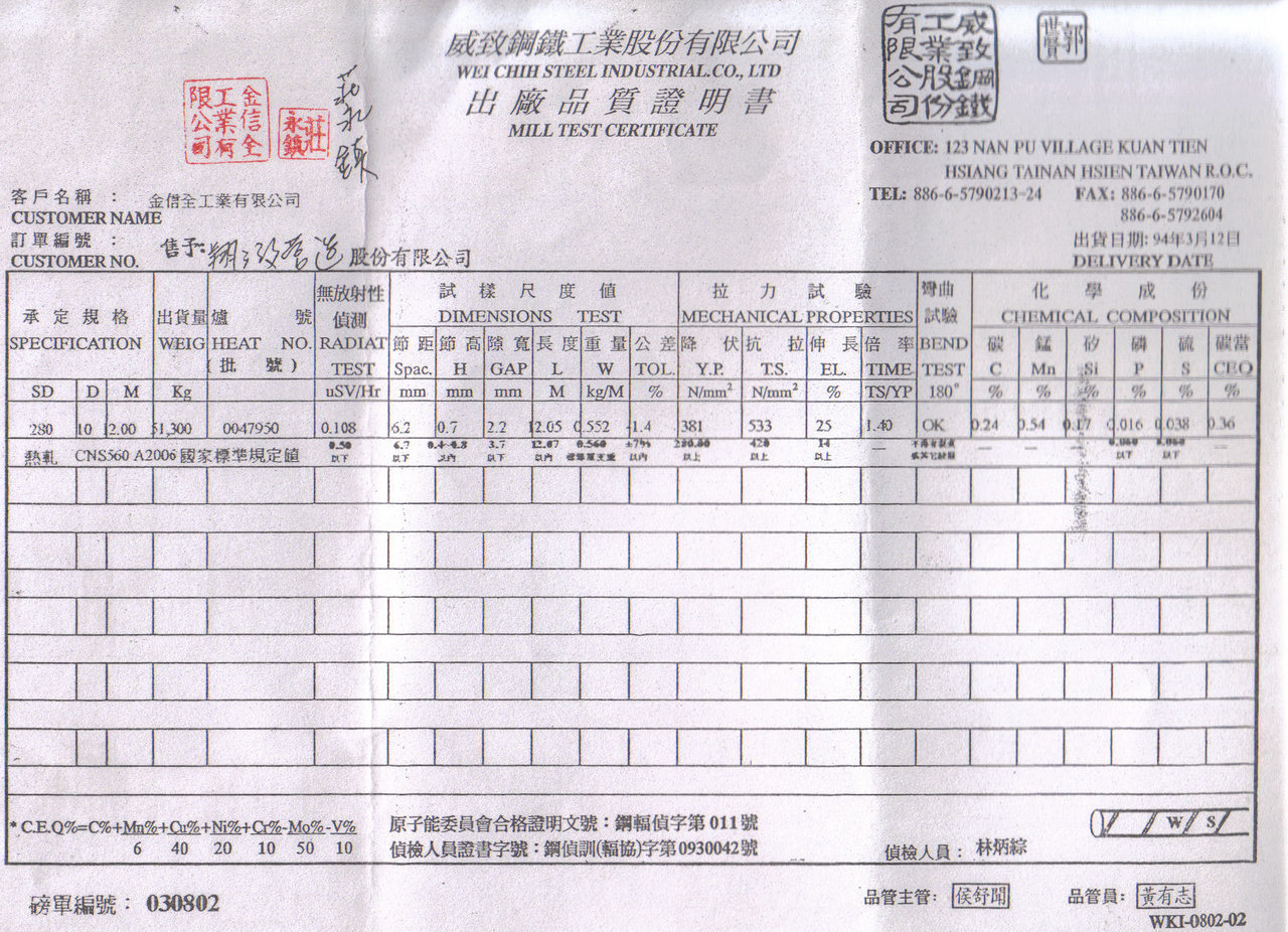 鋼筋出廠品質證明書